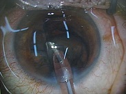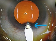 まずは、こんな感じで2mm程度のキズを黒目や、白目の部分に作り、目の中に器械などを入れる通り道を作ります。