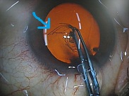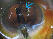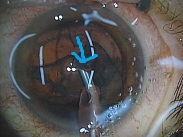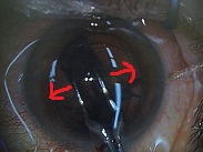 濁りを取り出して、キレイな袋だけの状態になったら、眼内レンズ(矢印)という新しいレンズを、小さく折りたたんで目の中に入れます。目の中でレンズを開いて、袋の中に固定します。(最近は、レンズを小さく折りたたんでいれ、目の中で開くことで、小さな傷口で手術ができるようになりました。)